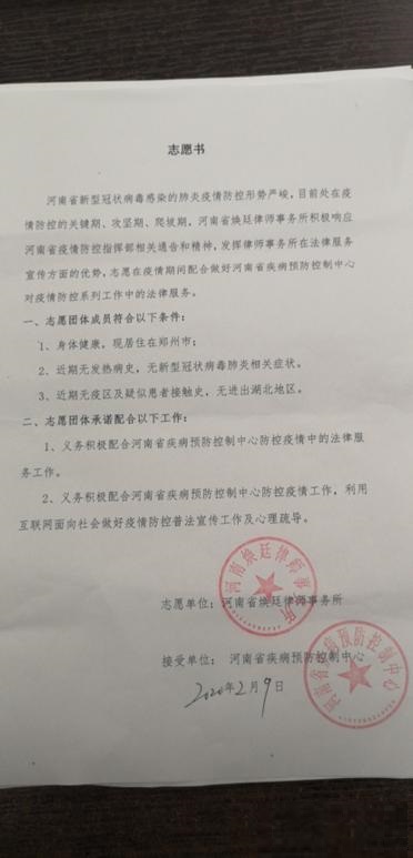 為落實省疫情防控指揮部相關(guān)決議,劉煥廷主任親自召開煥廷團隊內(nèi)部會議,研究部署志愿行動,借助社區(qū)、網(wǎng)絡(luò)渠道優(yōu)勢,配合宣傳,積極配合河南省疾病預(yù)防控制中心對疾病防控系列的工作,為打贏疫情攻堅戰(zhàn)提供法律服務(wù)。